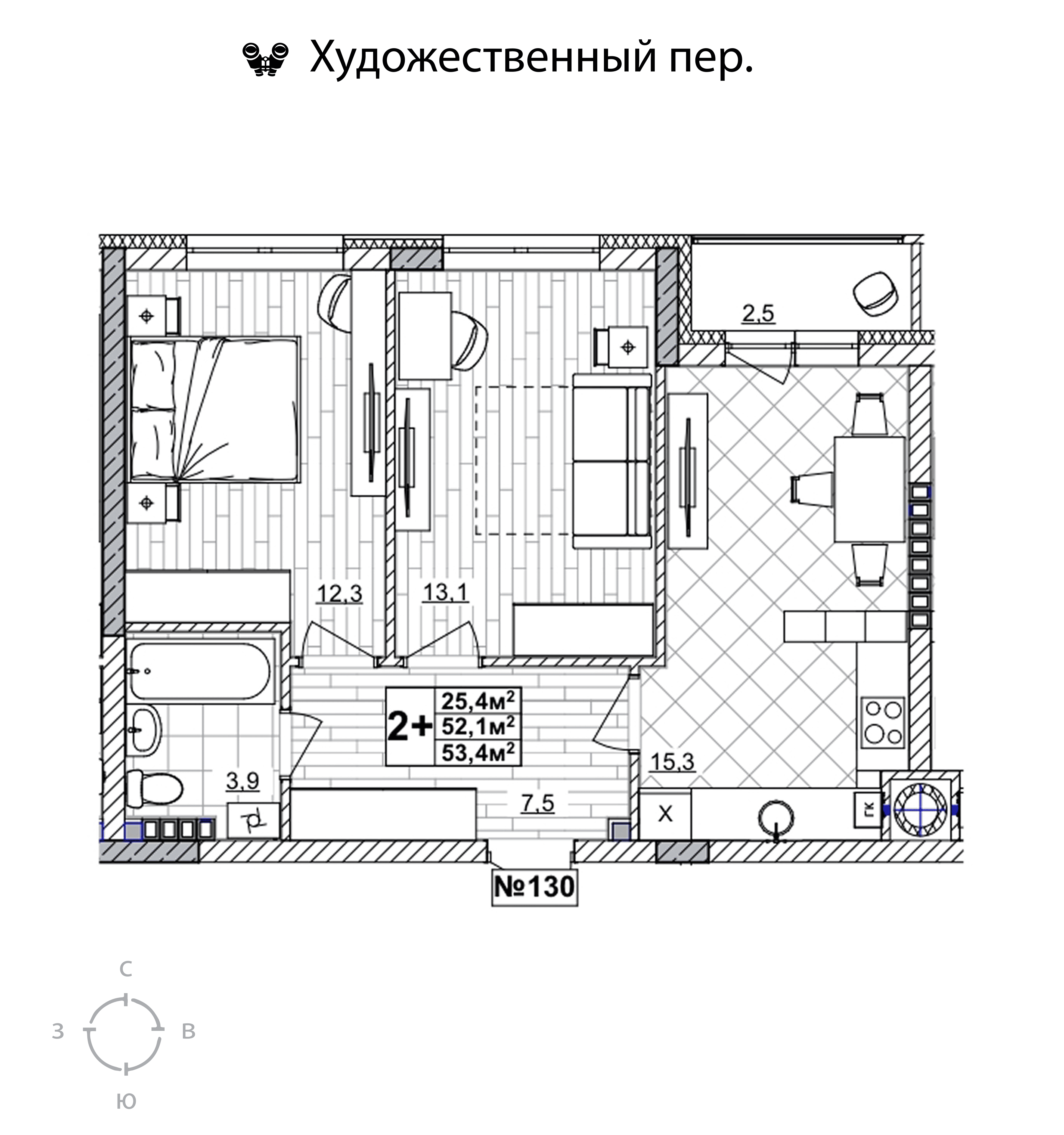 2-комнатная квартира - 53.4м2