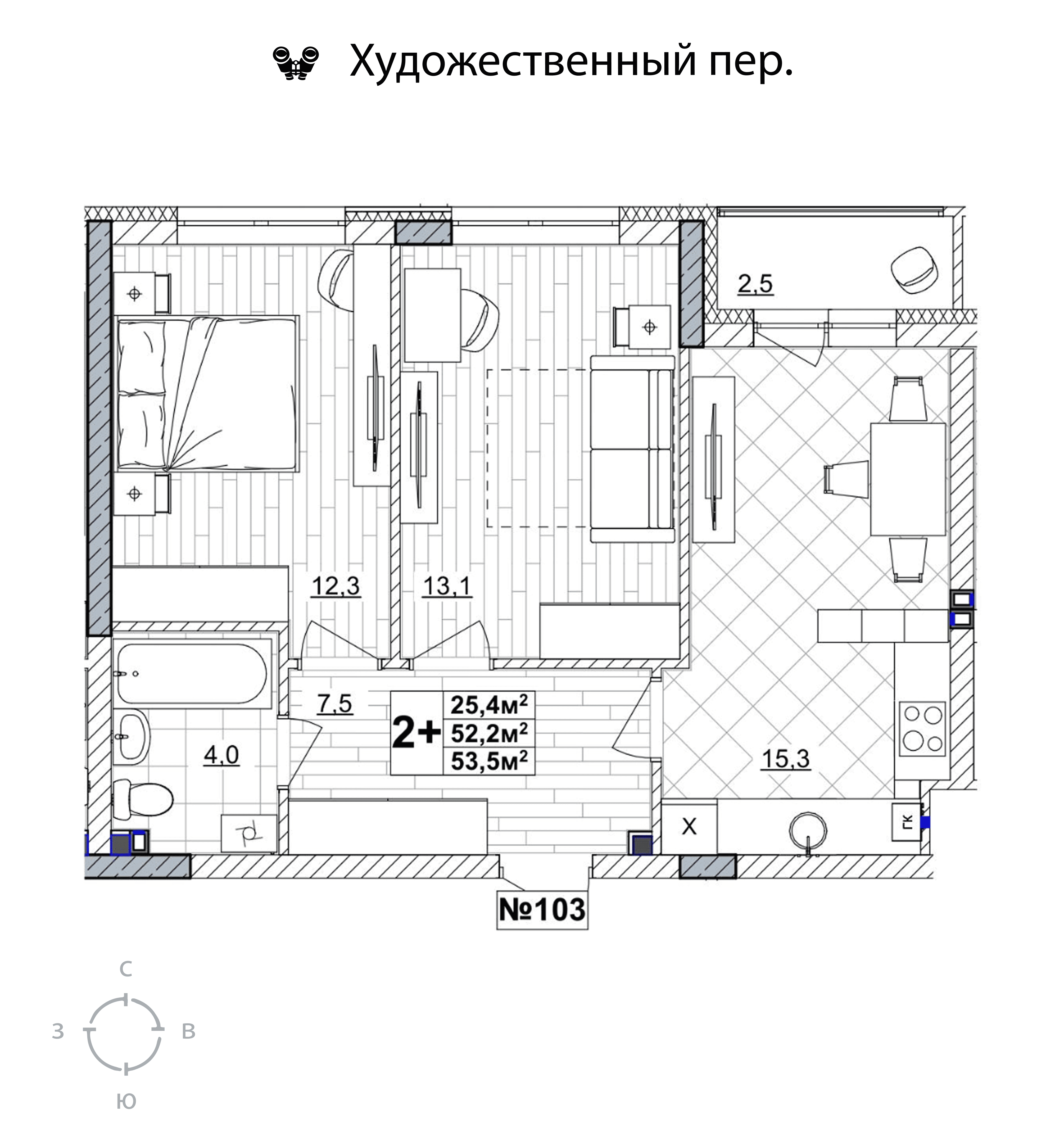 2-комнатная квартира - 53.5м2