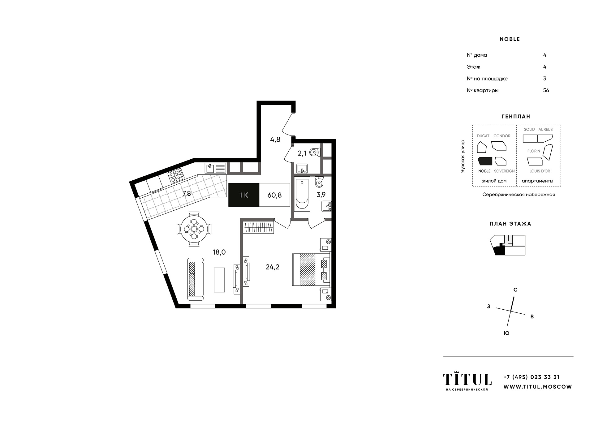 Квартира в TITUL на Серебрянической 60.80м2 на 4 этаже за 76 077 459 Р.